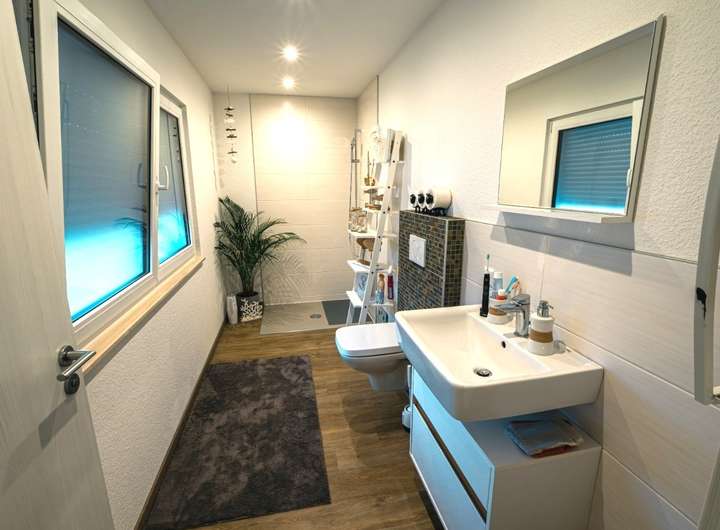 Ein modernes Duschbad mit WC und Fenster, der praktische Hauswirtschaftsraum und ein weiteres Zimmer für Gäste oder Homeoffice runden das Erdgeschoss ab.