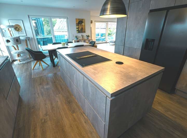 Die exklusive Einbauküche in Betonoptik stammt vom Küchenstudio und lässt keine Wünsche offen: