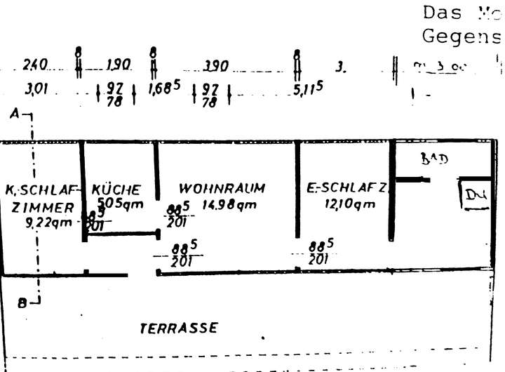Insgesamt drei Schlafzimmer, ein Wohn-/Essbereich, ein Duschbad sowie die Küche gehören zum Raumprogramm.