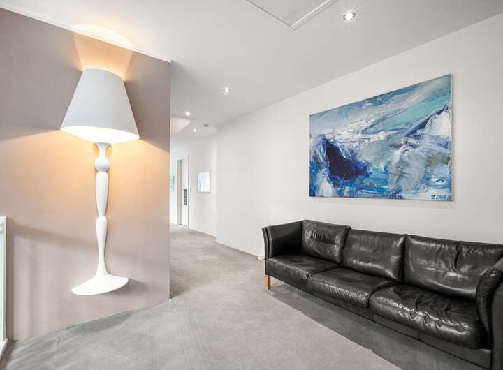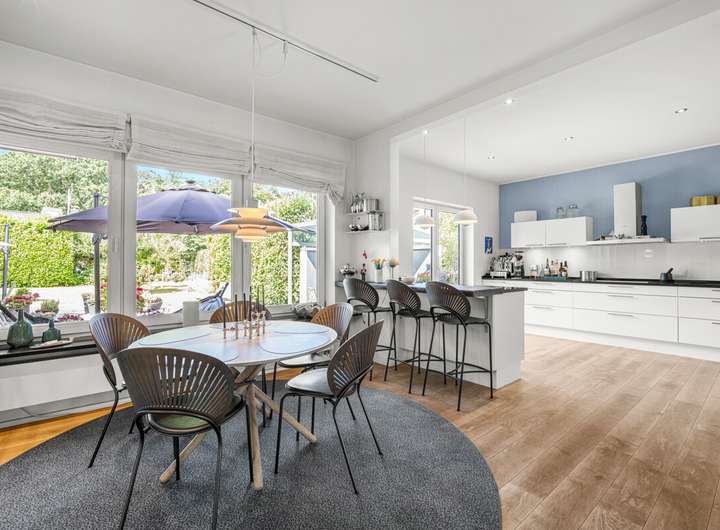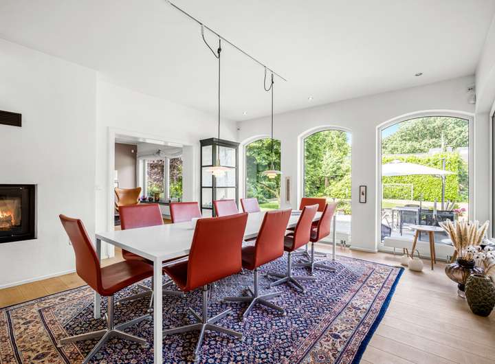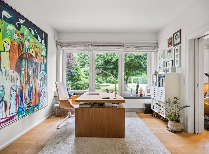 Das Erdgeschoss beeindruckt mit einer eleganten Diele aus Solnhofener Naturstein, einem großzügigen Wohnzimmer mit Tunnelkamin, einem lichtdurchfluteten Essbereich, separatem Arbeitszimmer und einer ca. 30 m² großen Wohnküche mit Hauswirtschaftsraum. Ein separater Gästebereich mit Schlafzimmer und Bad en Suite ergänzt das Raumangebot.