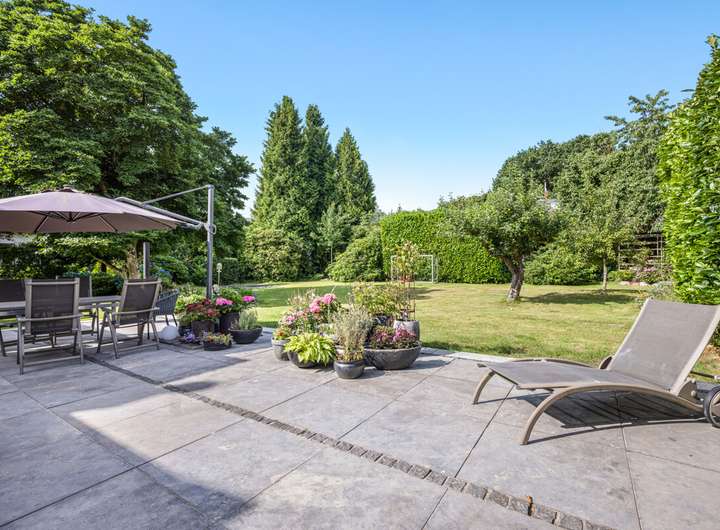 Der aufwendig gestaltete Westgarten bietet mit großer Naturstein-Terrasse, Pavillon und Außenküche ein Höchstmaß an Privatsphäre und Lebensqualität. Das Haus ist teilweise unterkellert und verfügt über Weinkeller, Technikräume sowie eine integrierte Garage.