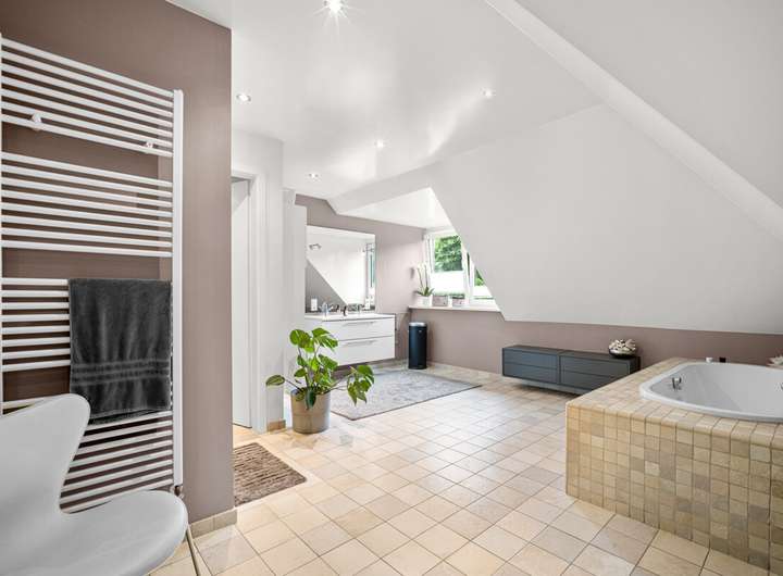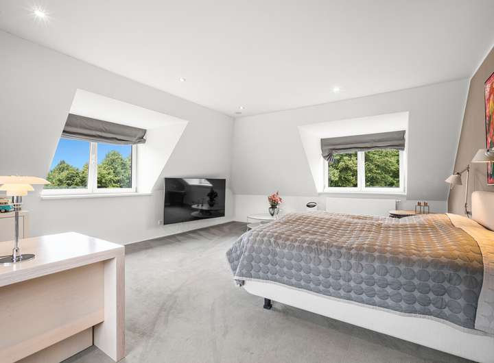 Im Obergeschoss befindet sich der private Rückzugsbereich mit Elternschlafzimmer, Ankleide, Bad en Suite sowie drei Kinderzimmern und einem weiteren Duschbad.