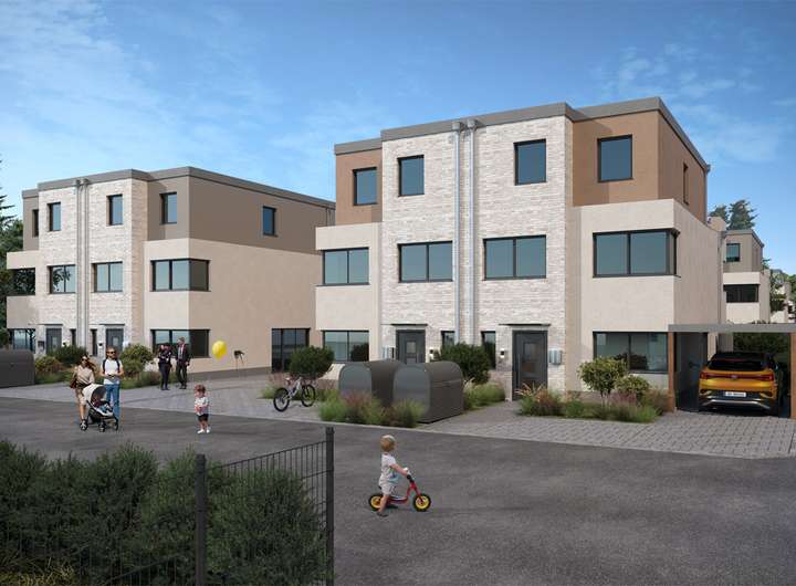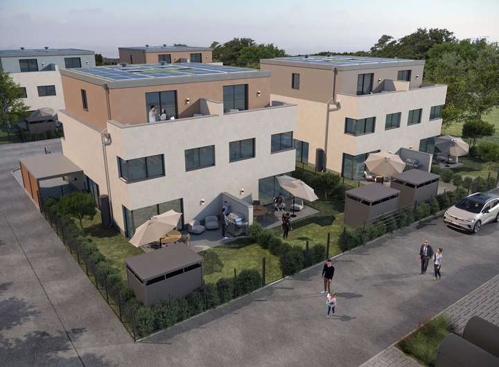 Die großzügig geschnittene Doppelhaushälfte überzeugt durch ihre durchdachte Raumaufteilung über drei Etagen. Der lichtdurchflutete Wohn- und Essbereich mit großen Fenstern und Terrassenzugang bildet das Herzstück des Erdgeschosses. Das Obergeschoss beherbergt drei Kinderzimmer sowie ein Tageslichtbad mit Duschkabine, zwei Waschbecken und einer großen Badewanne als Highlight. Das Dachgeschoss wartet mit dem Elternschlafzimmer inklusive Ankleidebereich und eigener Dachterrasse auf. Ein separater Homeoffice-Bereich sowie ein zweites Tageslichtbad runden das Raumangebot ab. Hochwertige Sanitärobjekte und eine Video-Sprechanlage unterstreichen den gehobenen Ausstattungsstandard. Das innovative Energiekonzept macht den entscheidenden Unterschied: Die PV-Anlage mit 8,1 kWp erzeugt jährlich rund 7.900 kWh, während der kalkulierte Jahresverbrauch nur 6.900 kWh beträgt. In Verbindung mit dem Energiespeicher mit 11 kWh wird eine enorme Einsparung bei den Nebenkosten erreicht und das Haus zum echten Plusenergiehaus. Besondere Inklusivleistungen sorgen für Wohnkomfort von Anfang an: Die Außenbeleuchtung mit LED-Wandleuchten ist ebenso enthalten wie die praktische Regentonne mit 500 Liter Fassungsvermögen und die hochwertige Schlauchbox mit 30-Meter-Schlauch. Die fertig verlegte Terrasse mit hochwertigen Bodenplatten und die exklusive Dachterrasse mit Feinsteinzeugfliesen schaffen zusätzliche Wohnräume im Freien. In unserer detaillierten Baubeschreibung finden Sie alle Leistungen und Ausstattungsmerkmale transparent aufgelistet. Eckdaten der Wohnung • Wohnfläche: ca. 175 m² • Grundstücksfläche: ab 240 m² • Zimmeranzahl: 6 Zimmer • Schlafzimmer: 4 • Badezimmer: 2 Tageslichtbäder + Gäste-WC • Terrasse und Dachterrasse • PKW-Stellplätze: 2 Außenstellplätze • Bezugsfrei ab: Dezember 2025 Ausstattungshighlights • PV-Anlage mit 8,1 kWp und Energiespeicher mit 11 kWh • Effizientes Kombinationsgerät für Heizen, Warmwasserbereitung und Lüftung mit Wärmerückgewinnung • Fußbodenheizung im gesamten Haus • Wärmepumpe als umweltfreundliches Heizsystem • Massivbauweise mit Kalksandstein und hochwertigen Qualitätsbaustoffen • Wärme- und schallisolierende Bauweise mit Entkopplung zum Nachbarhaus • Fassaden-Edelputz des Wärmedämmverbundsystems • Video-Sprechanlage mit drei Bedieneinheiten und Smartphone-Anbindung • Hochwertige Sanitärobjekte in allen Bädern • Stufenloser Zugang • Hauswirtschaftsraum und Abstellräume • Qualitätstreppen von Stadler mit Massivholzstufen • Elektrische Rollläden an allen Fenstern und Fenstertüren • USB-Ladesteckdosen in Kinder- und Schlafzimmern sowie Wohn- und Homeoffice-Bereich • Komplette LED-Außenbeleuchtung • Regentonne 500 Liter und Schlauchbox mit 30 m Schlauch inklusive • Fertig verlegte Terrasse mit Bodenplatten und Dachterrasse mit Feinsteinzeugfliesen • Zusätzliche Fahrradstellplätze