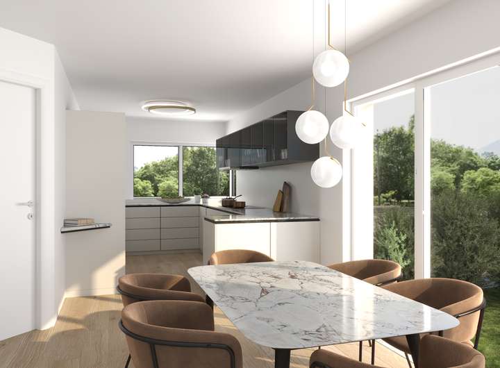 Die großzügig geschnittene Doppelhaushälfte überzeugt durch ihre durchdachte Raumaufteilung über drei Etagen. Der lichtdurchflutete Wohn- und Essbereich mit großen Fenstern und Terrassenzugang bildet das Herzstück des Erdgeschosses. Das Obergeschoss beherbergt drei Kinderzimmer sowie ein Tageslichtbad mit Duschkabine, zwei Waschbecken und einer großen Badewanne als Highlight. Das Dachgeschoss wartet mit dem Elternschlafzimmer inklusive Ankleidebereich und eigener Dachterrasse auf. Ein separater Homeoffice-Bereich sowie ein zweites Tageslichtbad runden das Raumangebot ab. Hochwertige Sanitärobjekte und eine Video-Sprechanlage unterstreichen den gehobenen Ausstattungsstandard. Das innovative Energiekonzept macht den entscheidenden Unterschied: Die PV-Anlage mit 8,1 kWp erzeugt jährlich rund 7.900 kWh, während der kalkulierte Jahresverbrauch nur 6.900 kWh beträgt. In Verbindung mit dem Energiespeicher mit 11 kWh wird eine enorme Einsparung bei den Nebenkosten erreicht und das Haus zum echten Plusenergiehaus. Besondere Inklusivleistungen sorgen für Wohnkomfort von Anfang an: Die Außenbeleuchtung mit LED-Wandleuchten ist ebenso enthalten wie die praktische Regentonne mit 500 Liter Fassungsvermögen und die hochwertige Schlauchbox mit 30-Meter-Schlauch. Die fertig verlegte Terrasse mit hochwertigen Bodenplatten und die exklusive Dachterrasse mit Feinsteinzeugfliesen schaffen zusätzliche Wohnräume im Freien. In unserer detaillierten Baubeschreibung finden Sie alle Leistungen und Ausstattungsmerkmale transparent aufgelistet. Eckdaten der Wohnung • Wohnfläche: ca. 175 m² • Grundstücksfläche: ab 240 m² • Zimmeranzahl: 6 Zimmer • Schlafzimmer: 4 • Badezimmer: 2 Tageslichtbäder + Gäste-WC • Terrasse und Dachterrasse • PKW-Stellplätze: 2 Außenstellplätze • Bezugsfrei ab: Dezember 2025 Ausstattungshighlights • PV-Anlage mit 8,1 kWp und Energiespeicher mit 11 kWh • Effizientes Kombinationsgerät für Heizen, Warmwasserbereitung und Lüftung mit Wärmerückgewinnung • Fußbodenheizung im gesamten Haus • Wärmepumpe als umweltfreundliches Heizsystem • Massivbauweise mit Kalksandstein und hochwertigen Qualitätsbaustoffen • Wärme- und schallisolierende Bauweise mit Entkopplung zum Nachbarhaus • Fassaden-Edelputz des Wärmedämmverbundsystems • Video-Sprechanlage mit drei Bedieneinheiten und Smartphone-Anbindung • Hochwertige Sanitärobjekte in allen Bädern • Stufenloser Zugang • Hauswirtschaftsraum und Abstellräume • Qualitätstreppen von Stadler mit Massivholzstufen • Elektrische Rollläden an allen Fenstern und Fenstertüren • USB-Ladesteckdosen in Kinder- und Schlafzimmern sowie Wohn- und Homeoffice-Bereich • Komplette LED-Außenbeleuchtung • Regentonne 500 Liter und Schlauchbox mit 30 m Schlauch inklusive • Fertig verlegte Terrasse mit Bodenplatten und Dachterrasse mit Feinsteinzeugfliesen • Zusätzliche Fahrradstellplätze