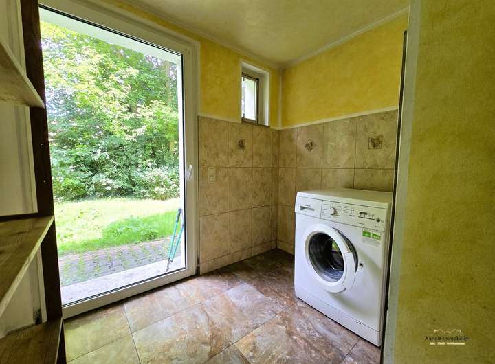 Das Haus erstreckt sich über zwei Etagen. Im Erdgeschoss empfängt Sie ein gemütliches Wohnzimmer, dessen Herzstück ein einladender Kamin ist – ideal für entspannte Abende. Die angrenzende Terrasse erweitert den Wohnraum ins Freie und bietet einen wunderschönen Blick in den weitläufigen Garten. Weiterhin befindet sich die Küche mit Speisekammer, die ebenfalls einen direkten Zugang nach Draußen hat, sowie das Badezimmer und Schlafzimmer im Erdgeschoss.