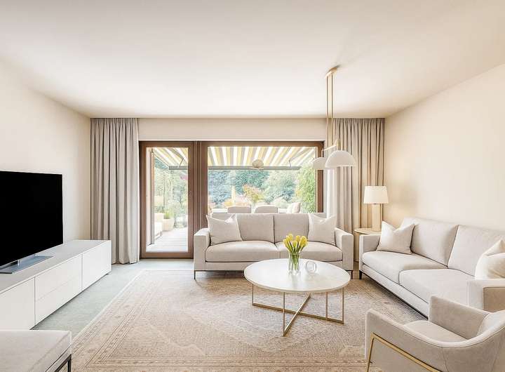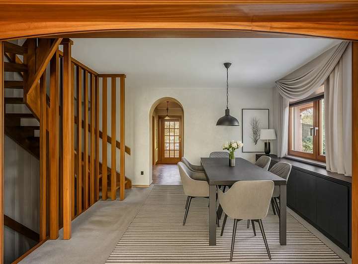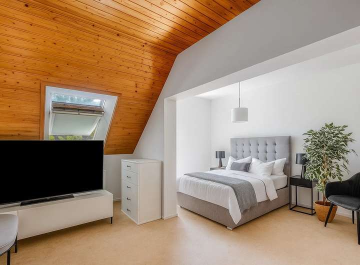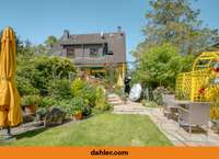 Rundum bietet die Doppelhaushälfte insgesamt fünf Zimmer, eine moderne Einbauküche mit Fußbodenheizung sowie ein Badezimmer und ein Gäste-WC. Vom Eingangsbereich gelangen Sie in den Wohn- und Essbereich mit einem Zugang zum malerisch angelegten Garten mit zwei Sonnenterrassen, die ebenfalls 2010 erneuert wurden. Im Obergeschoss erwarten Sie drei mögliche Schlafzimmer, die durch den Blick ins Grüne eine entspannte Atmosphäre schaffen. Die obere Etage wird durch ein komfortables, tagesbelichtetes Bad ergänzt. Eine weitere Schlaf- oder Büromöglichkeit finden Sie im Dachgeschoss mit Zentralheizung, welche sich über die gesamte Grundfläche erstreckt.