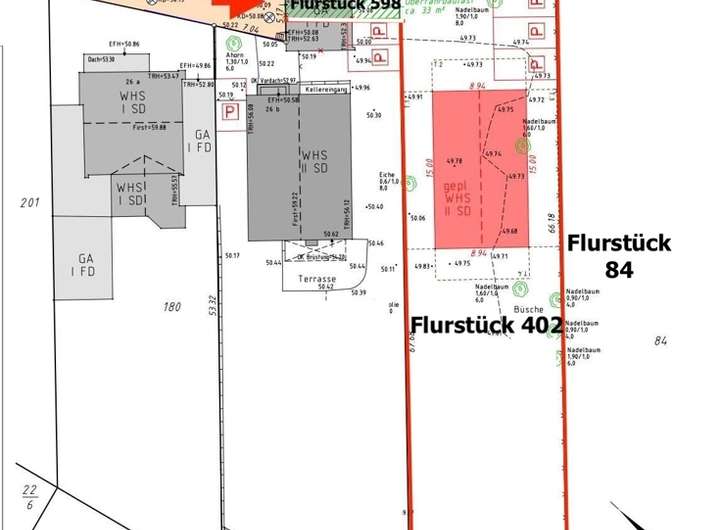 Das Grundstück (Flurstück 402) misst ca. 15,04 m × 67,68 m. Die Zufahrt erfolgt über das Flurstück 958 (ca. 4 m × 10,68 m) und ist durch eine noch einzutragende Dienstbarkeit (Geh-, Fahr- und Leitungsrecht) gesichert.