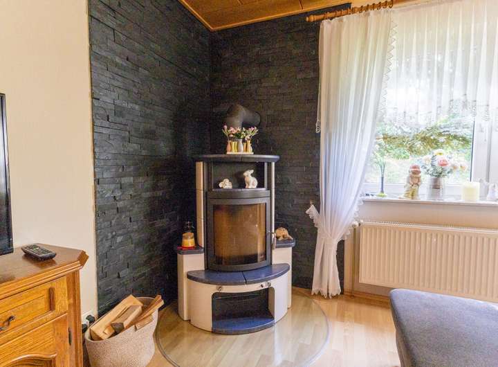 Das Erdgeschoss bietet eine harmonische Raumaufteilung: Ein gemütliches Wohnzimmer mit Kamin lädt zu entspannten Abenden ein und öffnet sich zur Terrasse und in den Garten. Die separate Küche mit moderner Einbauküche und praktischem Vorratsraum schafft ideale Voraussetzungen für gemeinsames Kochen und gesellige Mahlzeiten. Ergänzt wird diese Ebene durch ein Schlafzimmer, ein Badezimmer mit Badewanne, ein Gäste-WC sowie einen Abstellraum.