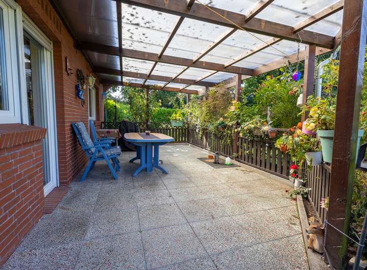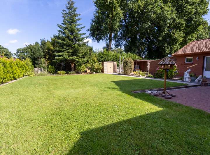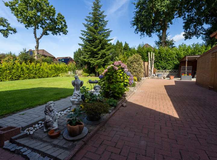 Der liebevoll angelegte Garten lädt mit einer gemütlichen überdachten Terrasse zum Entspannen und Verweilen ein. Zudem stehen eine Garage, ein Carport, zwei Gerätehäuser sowie ein Holzunterstand zur Verfügung – viel Platz also für Hobbys, Fahrzeuge und Gartengeräte.