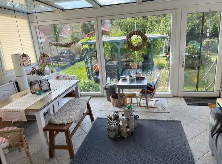 • heller Wintergarten von 2006 mit elektrischer Außenmarkise mit direkter Sicht in den Garten