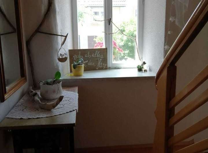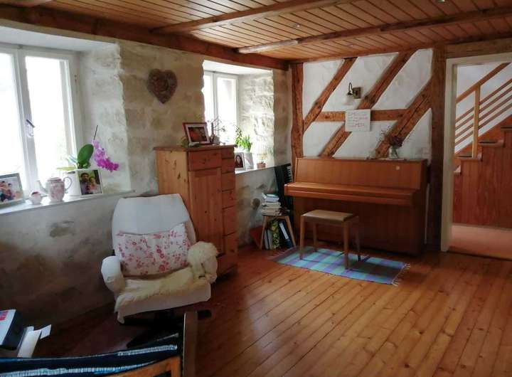 1. Etage: Eingang mit Diele, Bad mit Dusche, Küche mit Essecke. Großes Wohnzimmer 42m2 mit Wintergarten, teilweise Fachwerk, Fussbodenheizung.