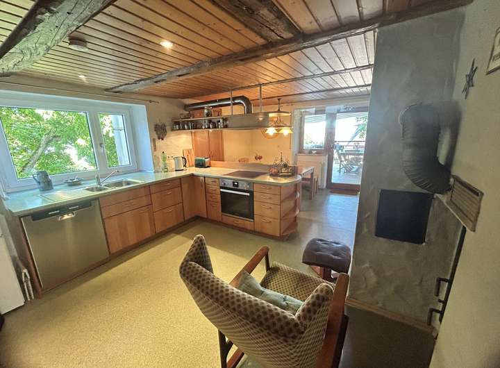 Die große Küche bietet genügend Platz für gemeinsames Kochen und gesellige Zeiten mit der Familie. Von hier aus betreten sie die große Terrasse mit Zugang zum liebevoll gestalteten, eingezäunten Garten.