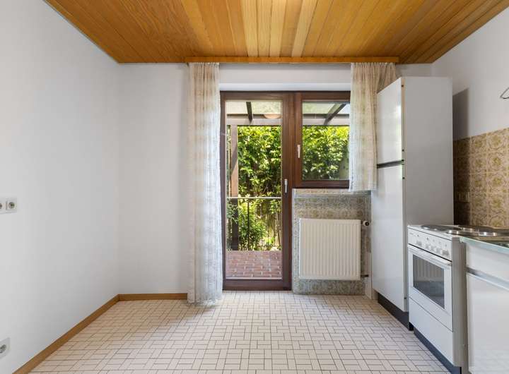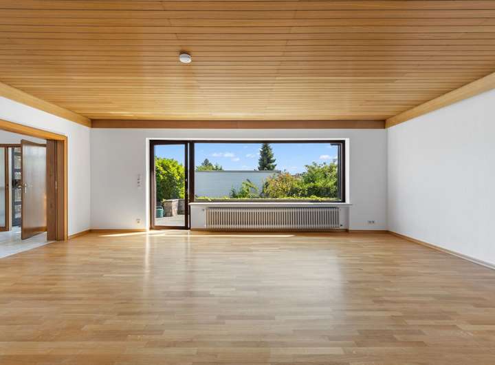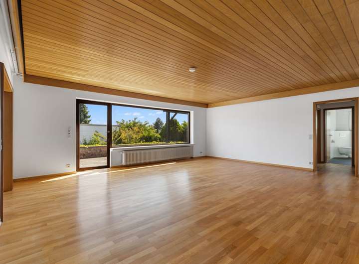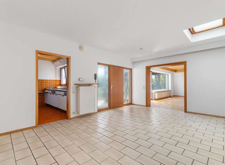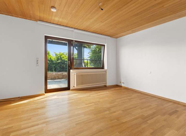 Großzügig präsentiert sich im Erdgeschoss der Hauptwohnung der ca. 64 m² große Wohn-Essbereich mit Zugang zur südorientierten, teilüberdachten und fast uneinsehbare Terrasse.