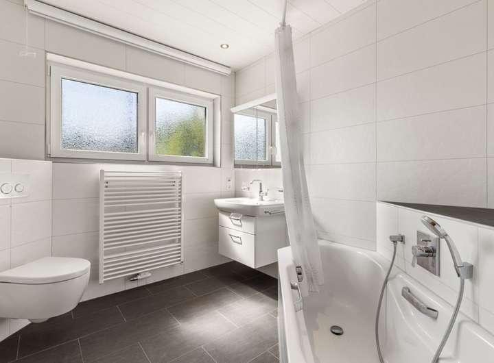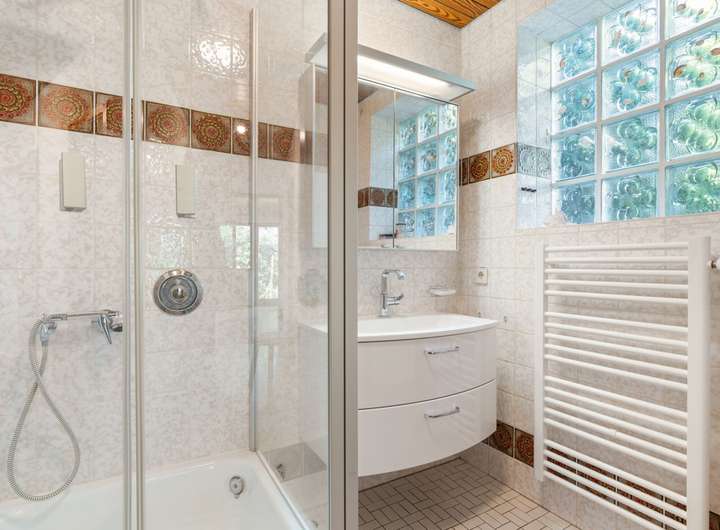 Modernisiertes Tageslichtbad (ca. 2013) mit Waschtisch, Eckwanne und Hängetoilette, deckenhoch weiß gefliest. Außerdem Tageslichtbad mit Waschtisch, Duschkabine, raumhoch beige gefliest sowie separates WC mit Standtoilette und Handwaschbecken