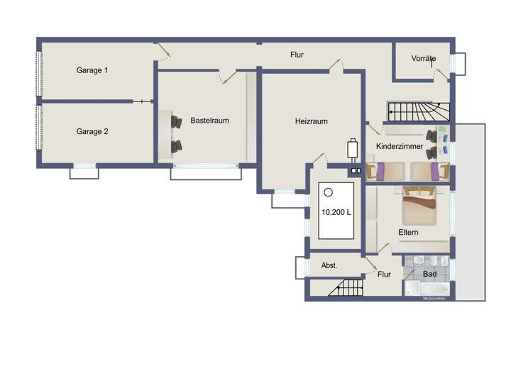 Das Untergeschoss beherbergt weiterhin einen sehr großen Hobbyraum, die üblichen Nebenräume und die beiden im Haus integrierten Garagen.