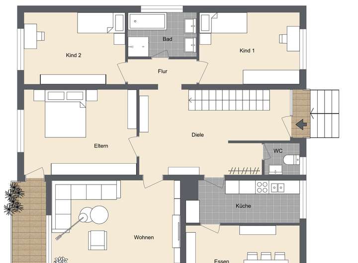 Im Erdgeschoss finden Sie außerdem ein separates WC im Eingangsbereich, ein gemütliches Schlafzimmer mit Balkonzugang sowie zwei Kinderzimmer, die Raum für Spiel, Spaß oder individuelle Gestaltungsideen lassen. Ein Badezimmer mit Badewanne und Dusche sorgt für Komfort im Alltag.
