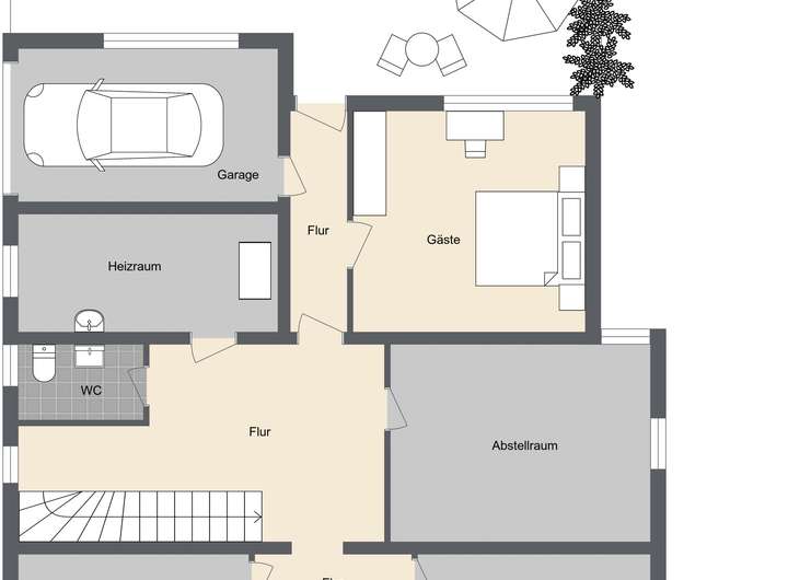 Auch das Untergeschoss hält viel bereit: ein großzügiger Flurbereich, ein Gästezimmer für Besucher, praktische Abstellräume, ein Heiz- und Tankraum sowie ein weiteres Badezimmer mit Dusche und ein separates WC. Besonders schön ist der direkte Zugang zum Garten und zur Terrasse, wo Sie sonnige Nachmittage genießen oder gesellige Abende verbringen können. Die innenliegende Garage mit direktem Zugang ins Haus macht das Wohnen hier noch komfortabler.