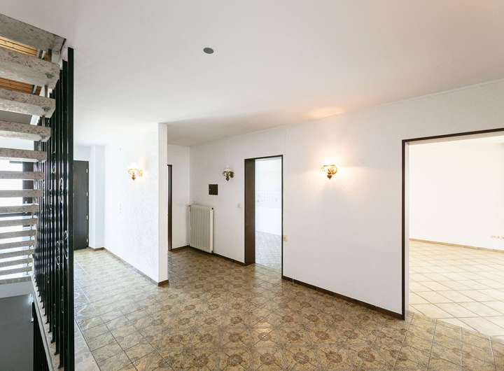 Schon beim Betreten des Hauses fällt der weitläufige Flur auf, der viel Raum und eine einladende Atmosphäre schafft. Von hier aus gelangen Sie in die Küche mit angrenzendem Esszimmer, das durch den direkten Zugang zum großen Balkon zum geselligen Mittelpunkt des Familienlebens wird. Das helle Wohnzimmer bietet mit seinen großen Fenstern einen wunderbaren Blick ins Grüne und lädt zu entspannten Stunden mit Familie und Freunden ein.