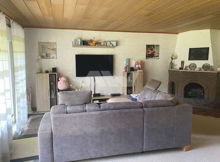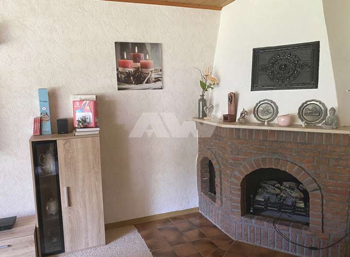 großes Wohn-/Esszimmer mit Kamin und Zugang zur Terrasse