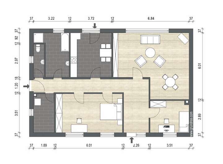 Das Einfamilienhaus mit einer Wohnfläche von 120 m² und großer Ausbaureserve im Dachgeschoss, teilt sich wie folgt auf: