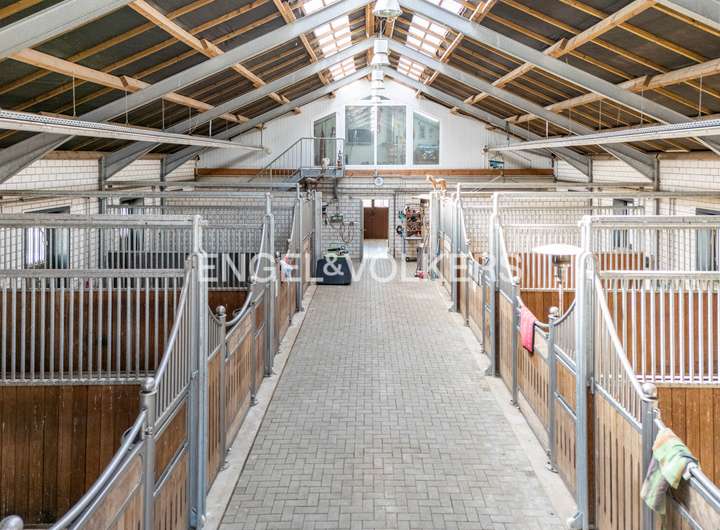Dieses eindrucksvolle Anwesen bietet nicht nur großzügiges Wohnen auf hohem Niveau, sondern auch vielfältige Möglichkeiten für Hobby, Beruf und Tierhaltung – ideal für Familien mit gehobenen Ansprüchen, Selbstständige oder Pferdeliebhaber. Mit rund 500 m² Wohnfläche und gehobener technischer Ausstattung erfüllt die Immobilie höchste Anforderungen an Komfort, Funktionalität und Lebensqualität. Errichtet nach dem KfW-75-Standard, überzeugt das Haus durch nachhaltige Bauweise und moderne Technik wie KNX-System zur Haussteuerung, Klimaanlagen, Gas-Brennwertheizung sowie Lüftungsanlage mit Wärmerückgewinnung im Erdgeschoss.