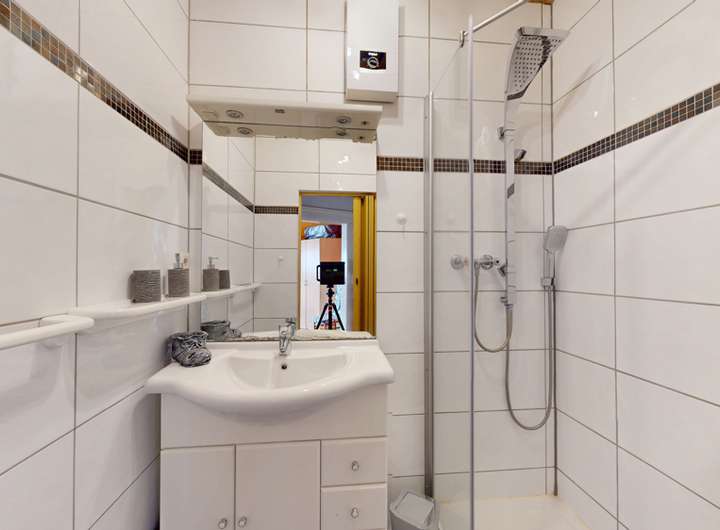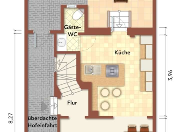 Im Erdgeschoss empfängt Sie ein offener Wohn- und Essbereich mit direktem Zugang zur offenen und modernen Küche. Von hier aus gelangen Sie zu einem ruhigen, blickgeschützten Innenhof – perfekt für entspannte Stunden im Freien. Ein separates Gäste-WC rundet diese Etage ab.