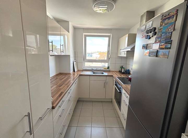 Die stilvolle Einbauküche fügt sich harmonisch in das Gesamtbild ein und bietet trotz kompakter Größe umfassenden Komfort. Auch das Tageslichtbad lässt keine Wünsche offen: Neben einer Duschbadewanne findet hier auch Ihre Waschmaschine bequem Platz.