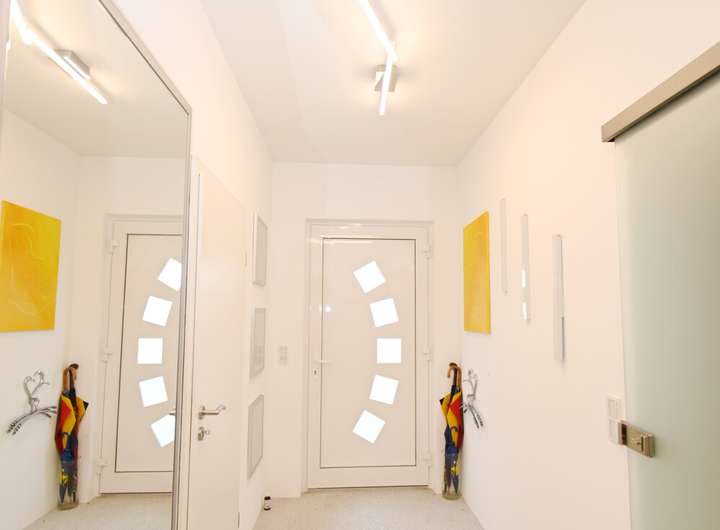 Das Herzstück des Hauses bildet der großzügige Wohn- und Essbereich, der mit seiner Offenheit zu gemeinsamen Stunden einlädt. Große Fensterfronten sorgen für eine angenehme Belichtung. Die direkt angeschlossene Küche ist mit modernen Einbauten versehen und lässt keine Wünsche hinsichtlich Funktionalität und Komfort offen.