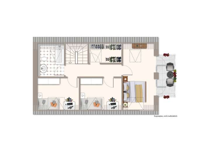 • Dachgeschoss: mit Terasse und Schlafbereich mit 3 Schlafzimmern sowie Badezimmer und einer Ankleide – ruhig und privat gelegen.