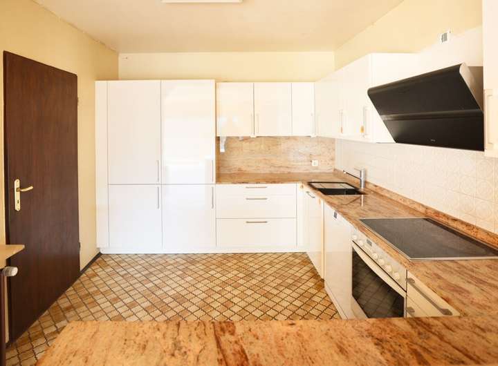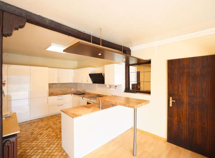 Die offene Einbauküche offenbart sich als Herzstück des Hauses. Der Übergang zum lichtdurchfluteten Wohnbereich sorgt für ein harmonisches Wohngefühl. Von hier aus gelangen Sie auf die großzügige Terrasse, die zu entspannten Stunden im Freien einlädt.