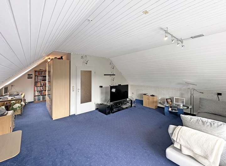 Beim Betreten des Objekts gelangen Sie über drei Stufen seitlich in den Eingangsbereich der Immobilie. Hier erwartet Sie eine offene Küche, die harmonisch in den großzügigen Wohn- und Essbereich übergeht und direkten Zugang zur einladenden Südterrasse und dem gepflegten Garten bietet. Ein Kamin sorgt im Wohnzimmer für gemütliche Abende in den kälteren Monaten. Im hinteren Bereich des Erdgeschosses befinden sich zudem ein Gäste-WC, ein hell gefliestes Duschbad, ein Schlafzimmer und ein Hauswirtschaftsraum. Das Dachgeschoss ist über eine geflieste Steintreppe erreichbar und offenbart ein geräumiges Schlafzimmer sowie ein zusätzliches Duschbad aus dem Baujahr. Besonders beeindruckend ist der große Wohn- oder Arbeitsbereich mit Zugang zu einer charmanten Loggia, der ideale Möglichkeiten für unterschiedliche Nutzungskonzepte bietet. Außerdem sind in diesem Raum bereits Anschlüsse für eine Küche vorhanden, sodass Sie nach Einbau einer Küche, die Immobilie als Zweifamilienhaus nutzen können.