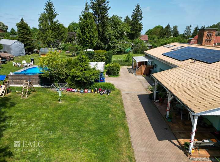 Auf dem Grundstück befinden sich ein Kinder-Spielplatz, ein Sommer-Pool, ein Gewächshaus, ein Doppel-Carport. Beide Wohneinheiten verfügen über eine überdachte Terrasse, mit Blick in den Garten.