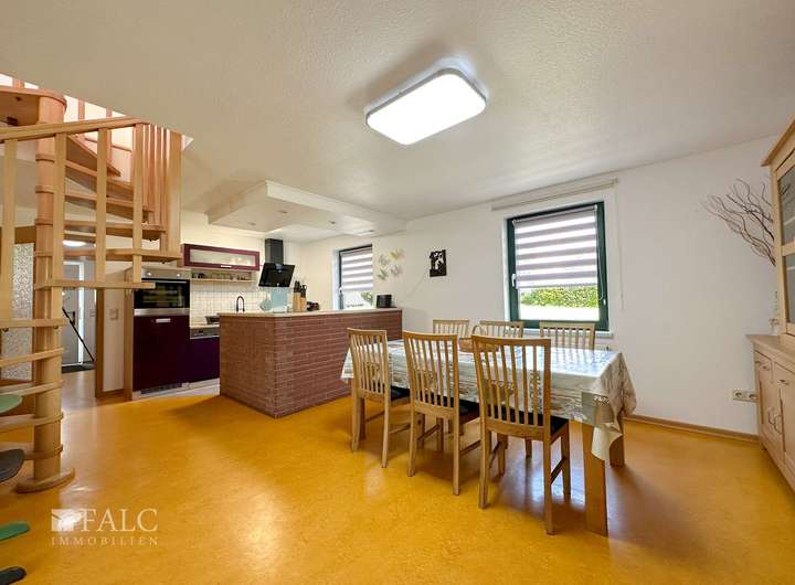 Das Wohnraum-Konzept der Hauptwohnung beinhaltet im Erdgeschoß einen Eingangsbereich mit Hauswirtschaftsraum, ein Wohnzimmer mit Kamin, ein Esszimmer, eine Küche, ausgestattet mit einer umfangreichen Einbauküche, ein Schlafzimmer, ein Kinderzimmer, ein Badezimmer und einen Hauswirtschaftsraum mit Zugang zur Garage, im Dachgeschoß befinden sich ein Arbeitszimmer, ein weiteres Schlafzimmer, ein Dusch-Bad und der Flurbereich.