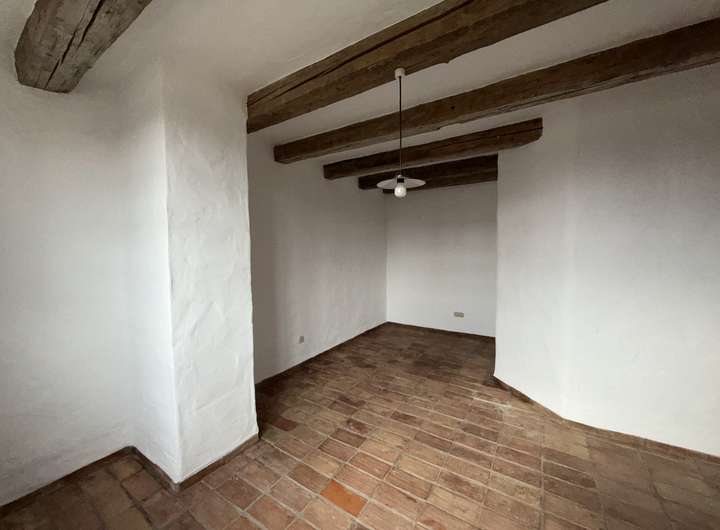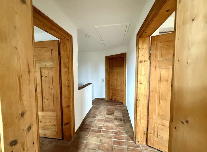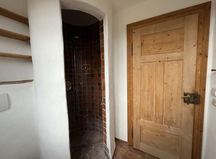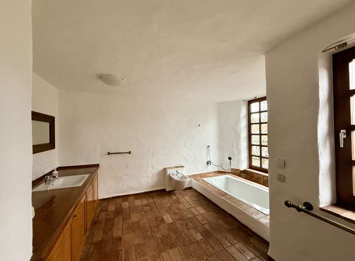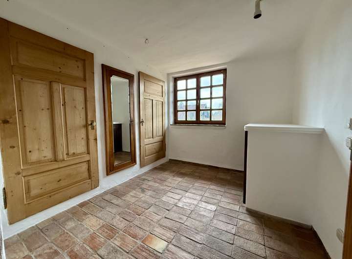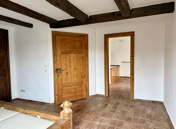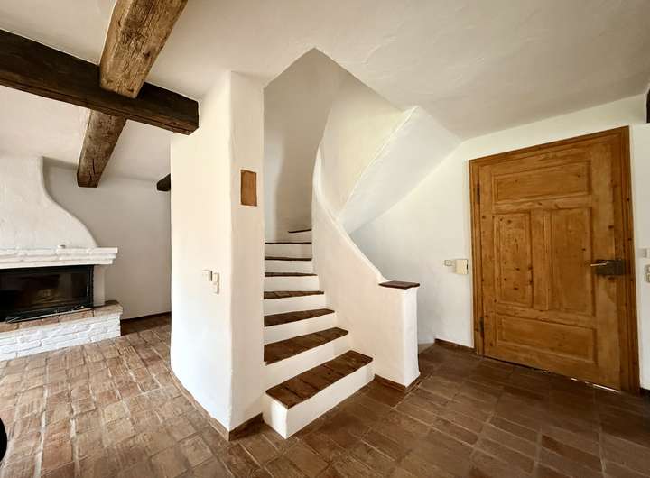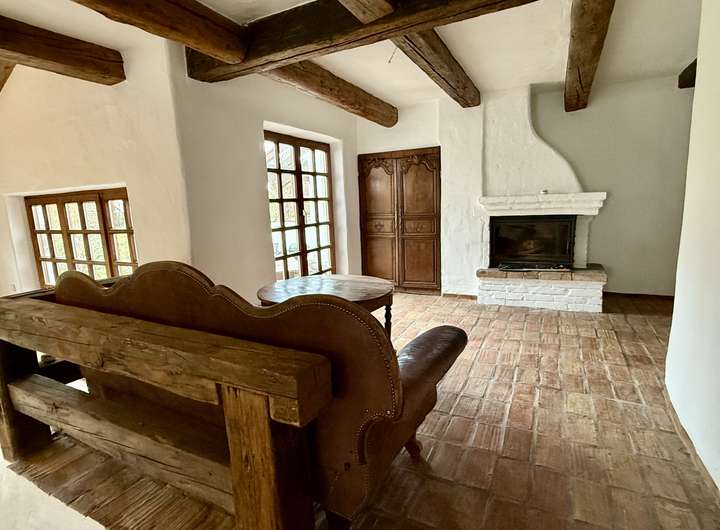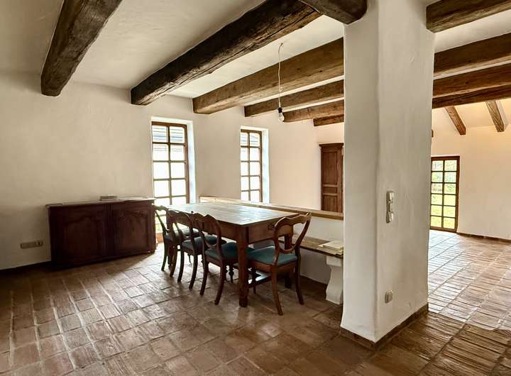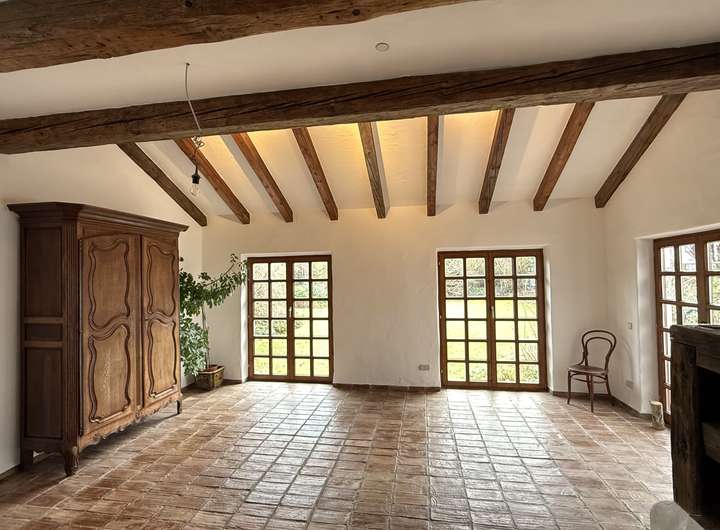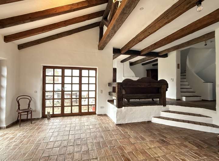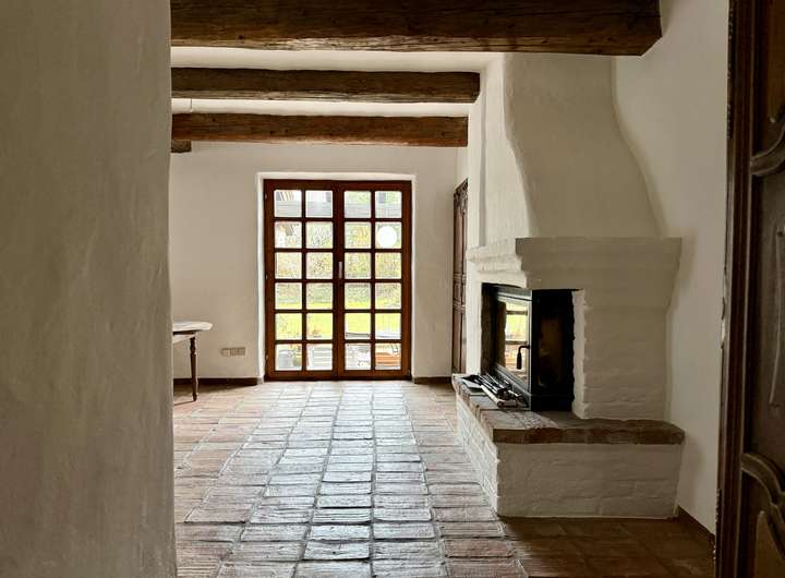 Das offen gestaltete Erdgeschoss bietet ein außergewöhnlich großzügiges Wohngefühl. Die Ausstattung wurde mit viel Liebe zum Detail zusammengestellt. Der aufwendige Putz mit gebürsteter Textur erinnert an Sommerurlaub an der Côte d’Azur. Der Fußboden im gesamten Haus ist mit historischen Fliesen ausgestattet. Die Balken an der Decke und die Zimmertüren sind ebenfalls antik.