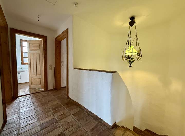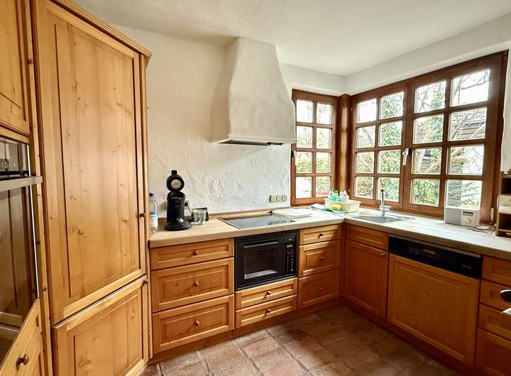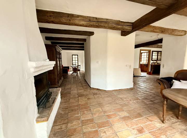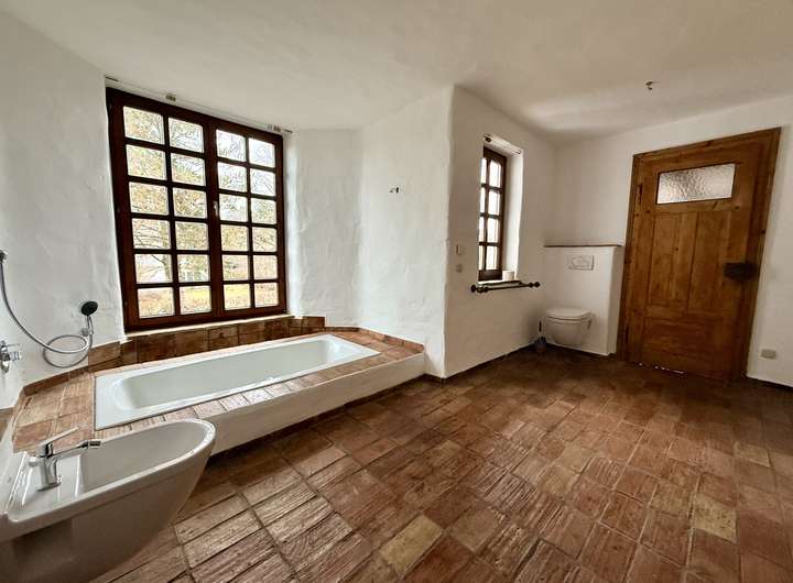 Historische Fliesen im EG und OG, antike Balken, bodentiefe Fenster, offener Kamin, Sauna und Fitnessraum, Fußbodenheizung, moderne Wärmepumpe, Wasserenthärtungsanlage, 2 WCs in den Bädern im OG und je ein Gäste-WC im EG und im Keller,
