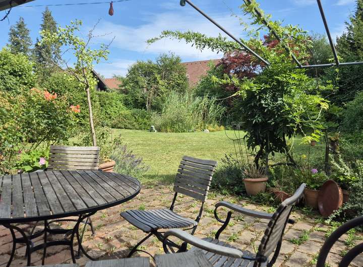Der offene Kamin verspricht gemütliche Winterabende, die Terrasse im Garten ist perfekt für Grillpartys. Neben der Garage gibt es zusätzlich einen Stellplatz direkt am Haus.