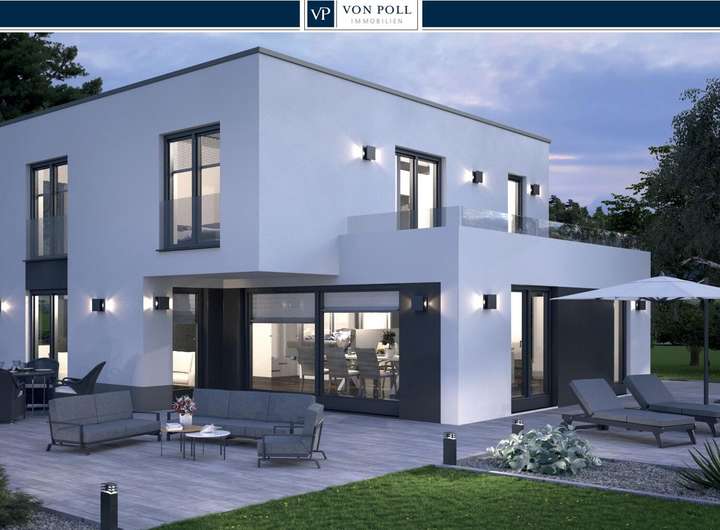 VON POLL - BAD HOMBURG: Projektierte, elegante Flachdach-Villa in malerischer Feldrandlage