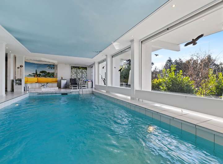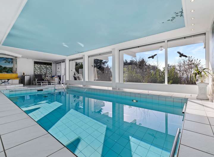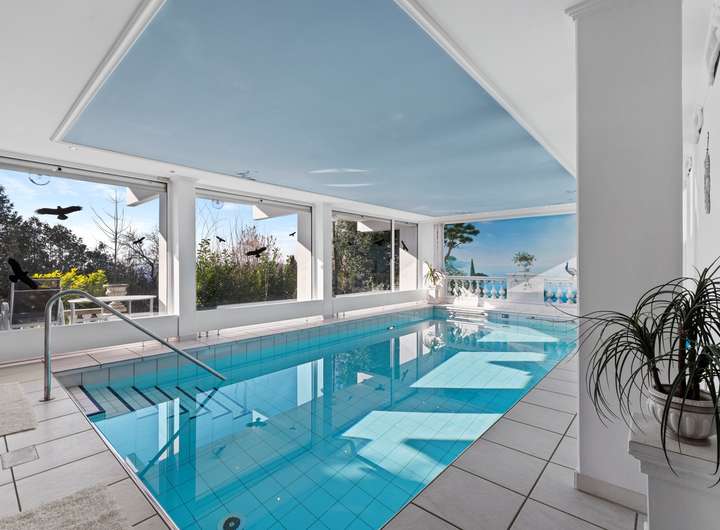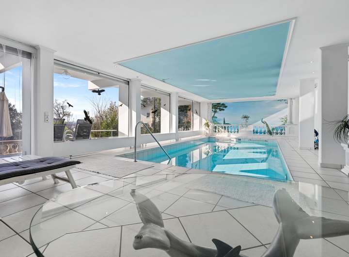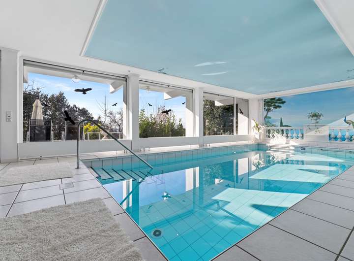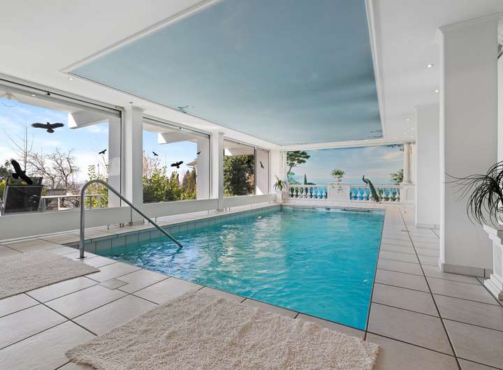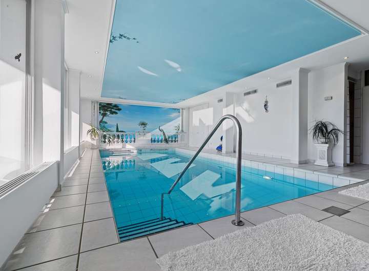 Das Herzstück dieser Villa ist das luxuriöse Schwimmbad im Untergeschoss. Mit einer Größe von 8 m x 4 m und einer maximalen Tiefe von 2 m ist es der perfekte Ort für entspannende Stunden. Auf der angrenzenden großzügigen Terrasse können Sie sonnenbaden oder eine kleine Schwimmpause einlegen. Das Schwimmbad ist uneinsehbar und verfügt über eine Gegenstromanlage sowie idyllische Wandmalereien, die eine wunderschöne Atmosphäre schaffen. Neben dem Schwimmbad finden Sie eine Sauna und eine Dusche mit Massagefunktion, die Ihr Wellness-Erlebnis abrunden.