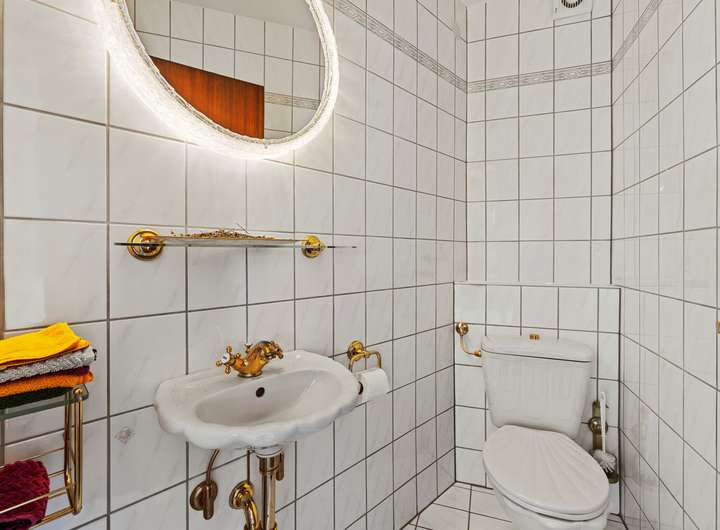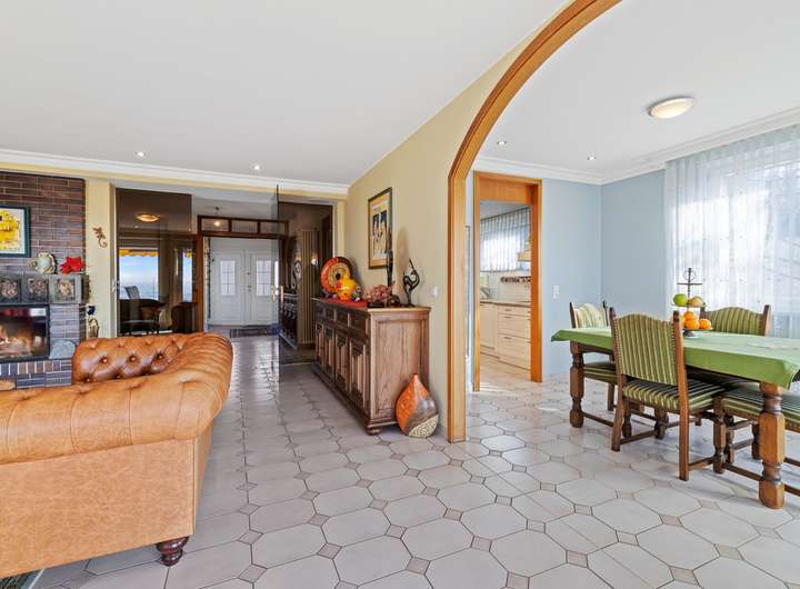 Die Bodenbeläge im Erd- und Untergeschoss sind vorwiegend mit eleganten Fliesen ausgestattet, während im Dachgeschoss ein gemütlicher Teppichboden verlegt ist. Der Eingangsbereich sowie das Treppenhaus sind mit edlem Natursteinboden gestaltet. Die Sanitäreinrichtungen im Erdgeschoss sind von höchster Qualität und das Tageslichtbad ist mit einer Whirlpool-Badewanne, Dusche, WC und Waschbecken ausgestattet. Ein Kaminofen im Wohnzimmer, verkleidet mit Klinker, sorgt für wohlige Wärme an kalten Tagen.