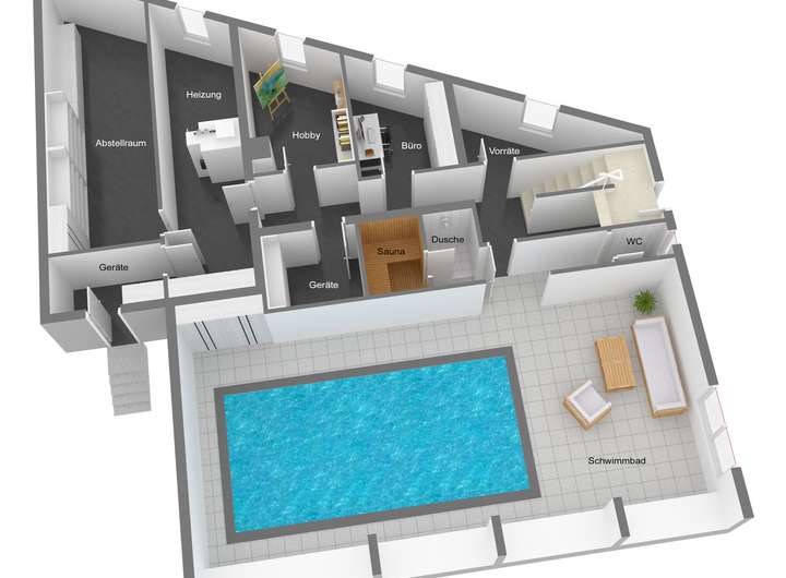 Das Untergeschoss ist komplett unterkellert und bietet Ihnen eine Vielzahl an Nutzungsmöglichkeiten. Hier finden Sie neben dem hochwertigen Schwimmbad auch eine Umkleide, ein WC, ein Büro, einen Hobbyraum, den Heizungsraum mit Pooltechnik, zwei Geräteräume sowie einen sehr großen Abstellraum.