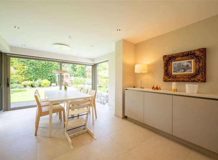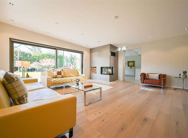 Im Erdgeschoss Ihres neuen Zuhauses erwartet Sie zunächst eine durch ein Oberlicht lichtdurchflutete Diele (ca. 16 m²), die durch hochwertige, maßgefertigte Schreinerarbeiten als große Garderobe genutzt wird. Im Anschluss geht man zur Rechten entweder in den ca. 36 m² großen Koch- und Essbereich oder in das knapp 40 m² große Wohnzimmer. Bei der Küche handelt es sich um eine vom Schreiner maßgefertigte Design-Einbauküche mit exquisiten Miele- und Siemenseinbaugeräten, u.a. auch einer Design-Dunstabzugshaube und einer Grohe Blue Trinkwasseraufbereitungsanlage. Highlight des Wohnbereichs ist der Panorama-Design-Kamin mit schöner Nische zum Lagern des Buchenholzes. Verbunden oder zu Trennen ist Wohnen/Essen über eine große Schiebetüre. Zum ca. 500 m² großen und reinem Garten und zur ca. 51 m² großen Gartenterrasse (zu 50% in die Wfl. gerechnet) öffnen sich beide Bereiche durch bodentiefe Schiebetüren (moderne Holzfenster mit Panzerglas). Die Terrasse ist durch das überkragende Dach geschützt.