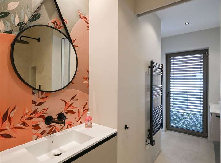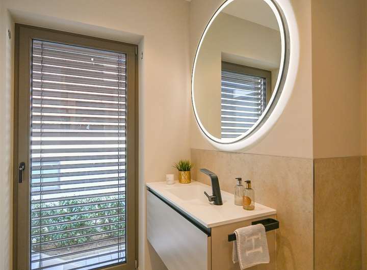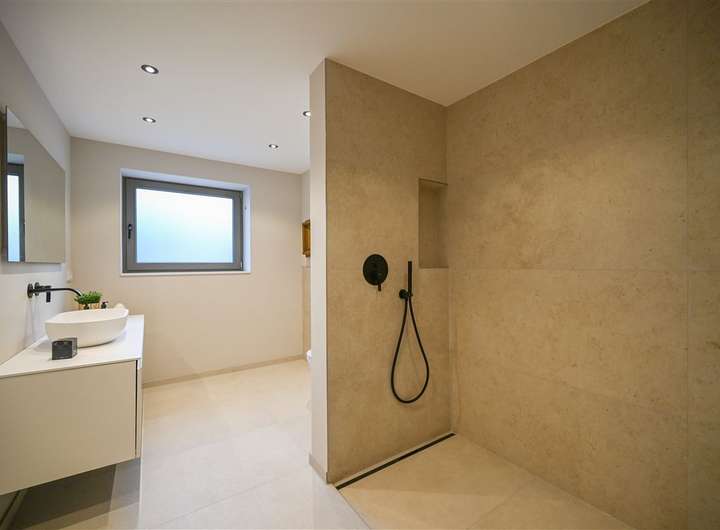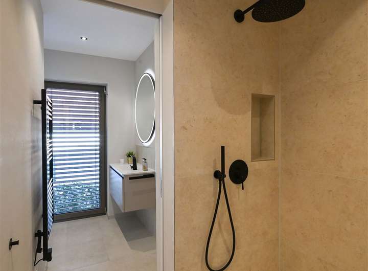 - Kombination aus luxuriösem Gäste-WC und Kinderbad mit Dusche, getrennt über eine maßgefertigte Schiebetüre vom Schreiner (ca. 7 m²)