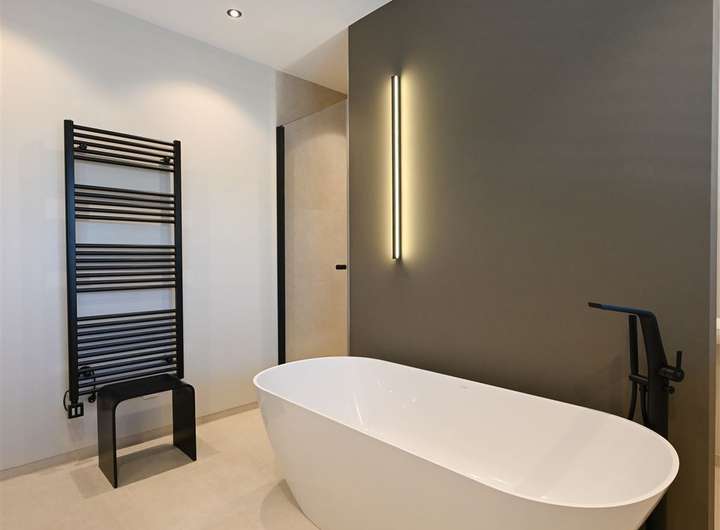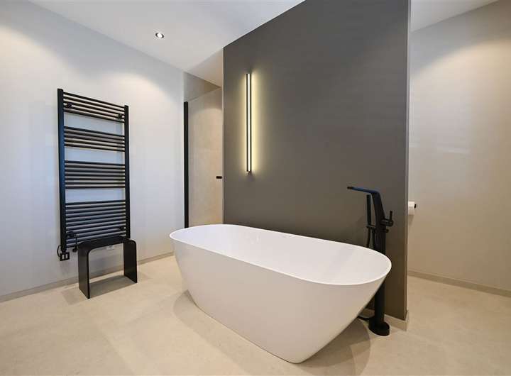 - Master-Bedroom mit Ankleidezimmer und eigenem Badezimmer mit Doppelwaschbecken (Corian-Stein), Regendusche, WC und freistehender, ovaler Design-Badewanne (Laufen Design), Armaturen von Steinberg