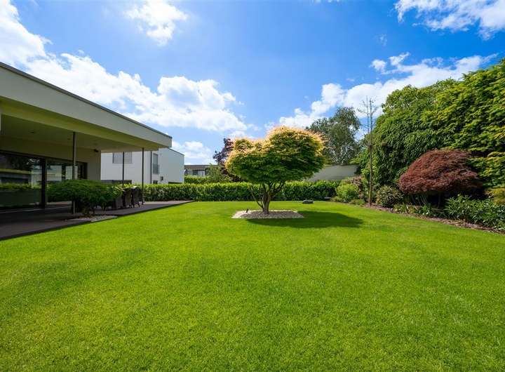 Diese außergewöhnliche Villa mit einer Wohn-Nutzfläche von ca. 327 m², davon ca. 285 m² reine Wfl. verbindet zeitlose Architektur mit exquisiter Ausstattung und bietet ein Wohngefühl auf höchstem Niveau auf zwei Ebenen - EG und UG - in Kronberg im Taunus. Das UG ist in den Hang gebaut und folglich kein "klassisches Untergeschoss", sondern ca. zur Hälfte ein EG mit weiterem Eingang zur Straßenseite. Von der Straße aus sieht man folglich die zweigeschossige Bebauung und gelangt per Treppe zum Haupteingang. Vom Garten aus, sieht man "nur" den luxuriösen Bungalow. Ursprünglich im Jahre 1971 erbaut, wurde die puristische Immobilie mit dezentem Schmetterlingsdach sowie 6 Zimmern und 3 Bädern von den beiden Eigentümern in den Jahren 2023/2024 umfassend und liebevoll kernsaniert und dezent erweitert (Neubauvolumen ca. 10 m²). Das Haus steht energetisch auf dem neuesten Stand mit Energieklasse A und einer Luft-Wärmepumpe von Viessmann (Fußbodenheizung). Das Grundstück ist schön eingewachsen und 771 m² groß. Die Gartenbeleuchtung stammt von Wever & Ducre, die Bewässerung von Hunter ist vollautomatisiert und der Mähroboter von Husqvarna bietet hervorragende Schnittpräzision.