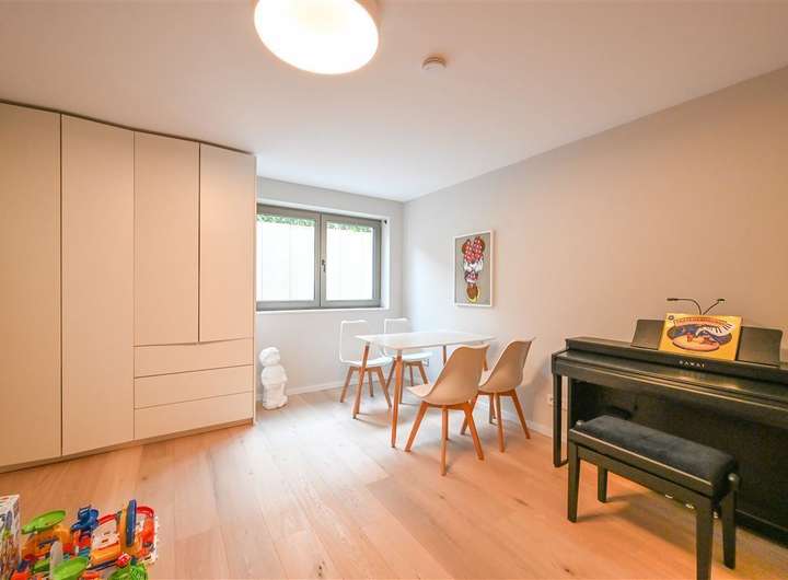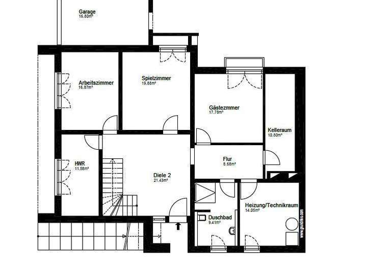 Das Untergeschoss bzw. "straßenseitige Erdgeschoss" mit großen Fensterflächen wurde bis auf die Lager- und Technikräume vollständig in hochwertiger Wohnraumqualität ausgebaut. Es präsentiert sich folglich hell und einladend und ist auch von außen zugänglich, d.h. es gibt einen zweiten und dritten Hauseingang über die Diele im UG sowie über die Garage zum Arbeitszimmer über ein Podest. Im UG empfängt Sie folglich ebenfalls eine großzügige Diele / Garderobe (ca. 21 m²), die als zentraler Verteiler zu den weiteren Räumen dient und mit einem weiteren hochwertigen und maßgefertigten Einbauschrank sowie einem freistehenden Schrankelement ausgestattet ist. Es stehen Ihnen im UG bzw. "straßenseitigem EG" ein schönes Arbeitszimmer (ca. 17 m²), ein Spielzimmer/Hobbyraum/Schlafzimmer (ca. 20 m²) und ein Gästezimmer (ca. 18 m²) zur Verfügung. Abgerundet wird der untere Bereich des Hauses mit einem modernen Tageslicht-Duschbad (ca. 10 m²), einem Kellerraum (ca. 11 m²), einem Heizungs- und Technikraum (ca. 14 m²) sowie einem Hauswirtschaftsraum (ca. 12 m²). Der Flur, der den linken mit dem rechten Flügel des UGs verbindet, ist ca. 9 m² groß.
