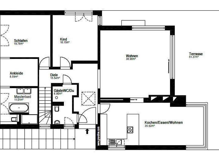 Vom Eingangsbereich zur Linken gelangt man zunächst in das luxuriöse Gäste-WC bzw. Kinderbad mit Dusche (ca. 7 m²; Trennung über eine Schiebetüre) sowie in ein Kinder-, Gäste- oder Arbeitszimmer (ca. 18 m²). Daneben liegt der Master-Bedroom (ca. 19 m²) mit maßgefertigter Ankleide (ca. 9 m²) sowie mit en Suite-Luxusbad (ca. 11 m²) mit Steinberg Armaturen, Corian-Waschbecken, bodengleicher Regendusche sowie als Highlight die freistehende, ovale Design-Badewanne von Laufen.