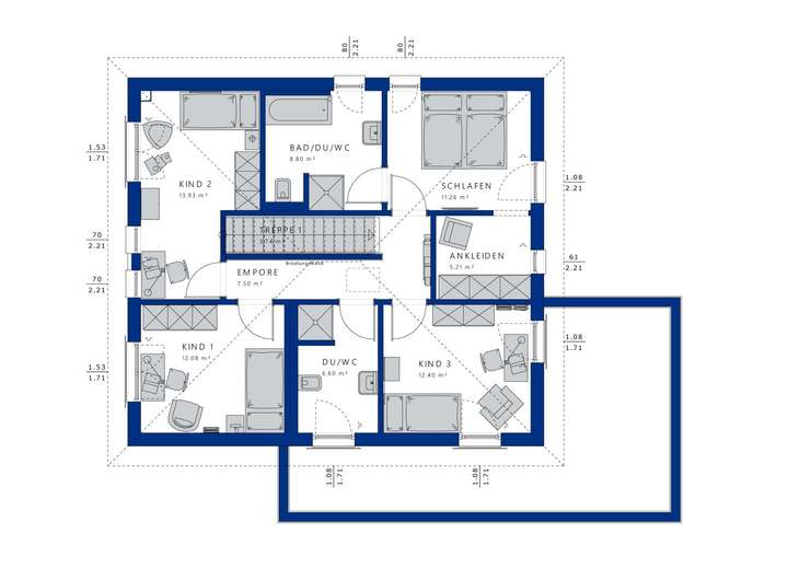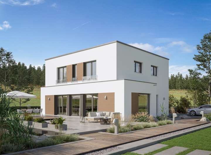Das EVOLUTION 162 überzeugt durch eine durchdachte Raumaufteilung auf zwei Etagen, die sowohl Funktionalität als auch Stil vereint. Mit sechs Zimmern bietet Ihr zukünftiges Zuhause Platz für persönliche Rückzugsorte, ein gemeinsames Familienleben und die Möglichkeit, ein Home-Office einzurichten. Die hellen Räume sind ideal miteinander verknüpft, sodass Sie von einem einladenden Wohn- und Essbereich in die modernen Schlafzimmer sowie die Badezimmer gelangen.
