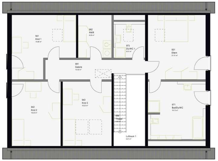 Unser FamilyStyle bietet auf einer Nettogrundfläche von 264 m² viel Raum für unterschiedlichste Wohnideen - vom Mehrgenerationenwohnen bis zur vermieteten Einliegerwohnung als Finanzierungshilfe. Möglich macht dies die Aufteilung des Hauses in eine komplette, separate Wohnung im Erdgeschoss - und das eineinhalbgeschossige Wohnen der Bauherrenfamilie, das das Erdgeschoss ausschließlich dem Lebensmittelpunkt im offen angelegten Wohn-, Ess- und Küchenbereich vorbehält. Im Obergeschoss gestatten 127 m² großzügiges Wohnen in drei Kinderzimmern samt eigenem Kinderbad sowie im Elternzimmer mit direkt angegliederter Wellness-Oase.