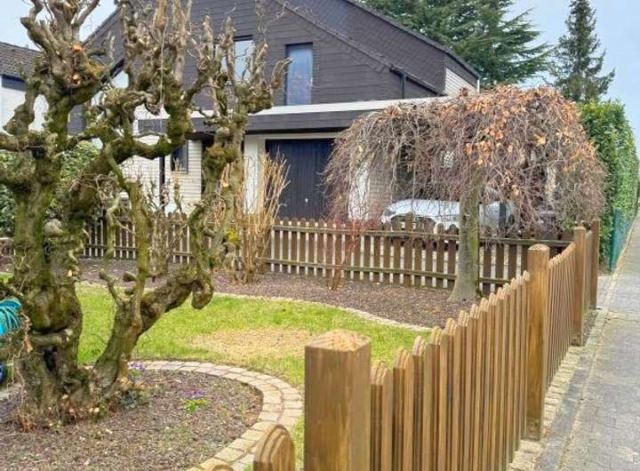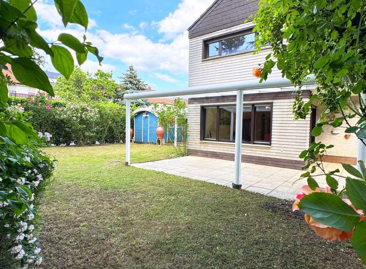 Mittlerweile ist der große Garten schön eingewachsen mit Teich und Gartenhütte.