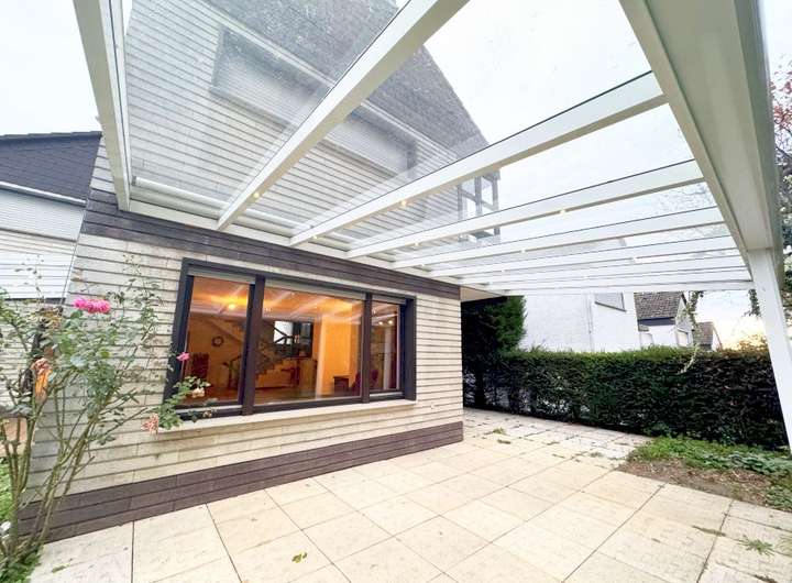 Die große Südwest-Terrasse bekam vor einigen Jahren eine Überdachung aus Glasdach und wurde mit einem elektrischen Rollo ausgestattet.